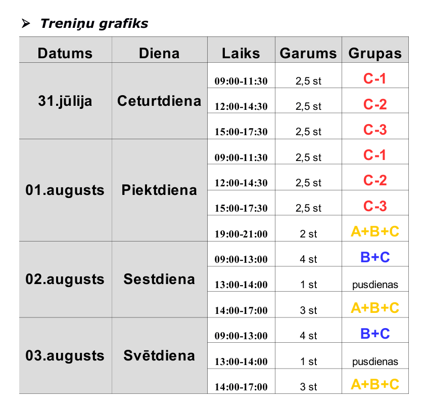 C (trīs apakšgrupas C1, C2, C3) – Platīna abonements – Individuālie treniņi + kopējie informatīvie treniņi + lekcijas (5 st individ treniņi (katrā apakšgrupā max 4 spēlētāji) + 8 st kopējie treniņi + 8 st lekcijas)