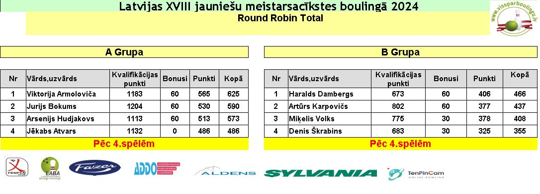 A. grupā par uzvarētāju kļuva kvalifikācijas kārtas 2 vietas ieguvēja – Viktorija Armoloviča (625 summa), otrā vieta Jurijam Bokumam. Jurijs otro vietu iegūst jau trīs čempionātus pēc kārtas. Jurija ķegļu summa – 590. Bronzas medaļu izcīnīja  – 1. Jauniešu Boulinga tūres 2023/24 B grupas kopvērtējuma uzvarētājs – Arsēnijs Hudjakovs (573 summa).