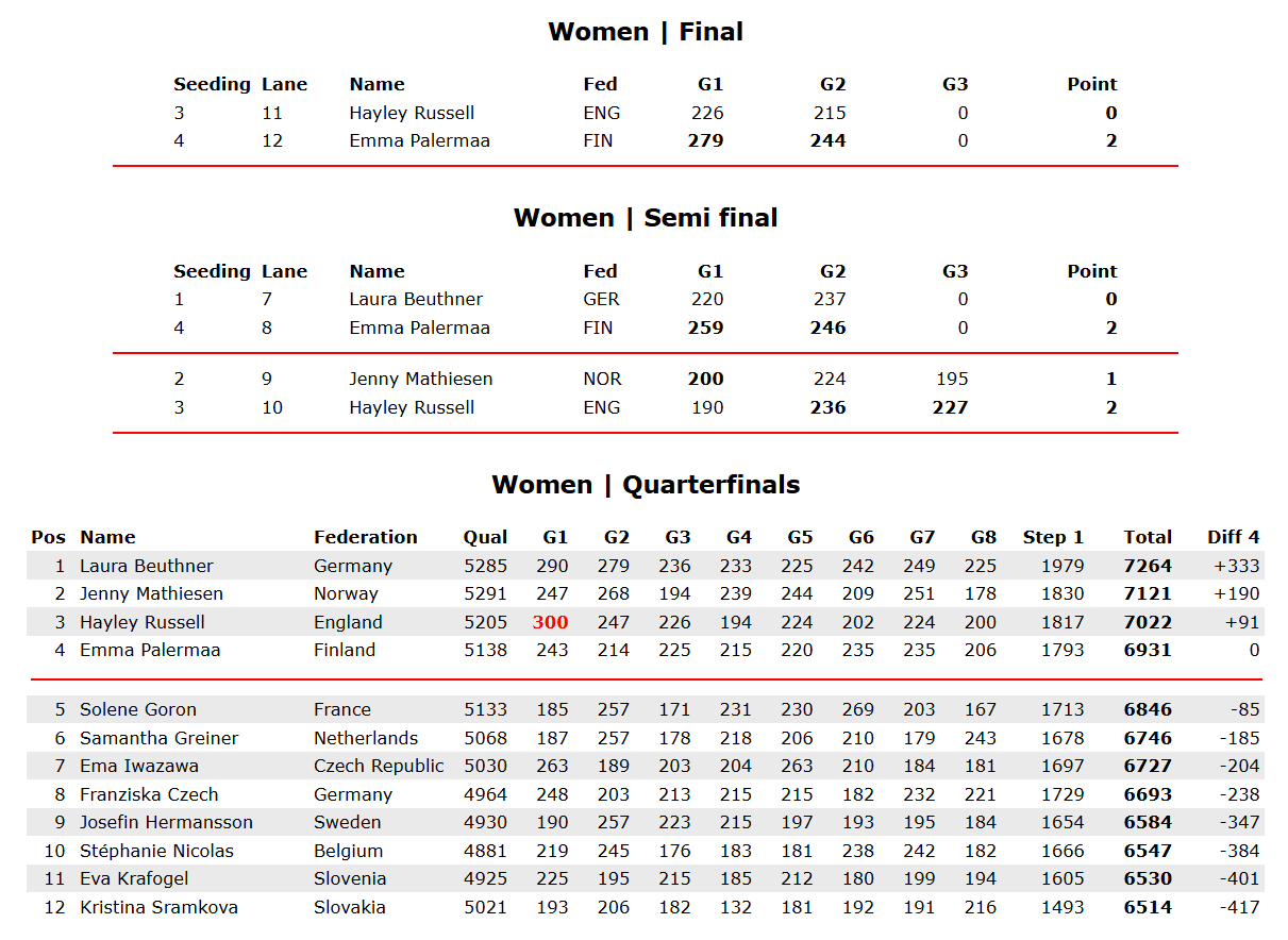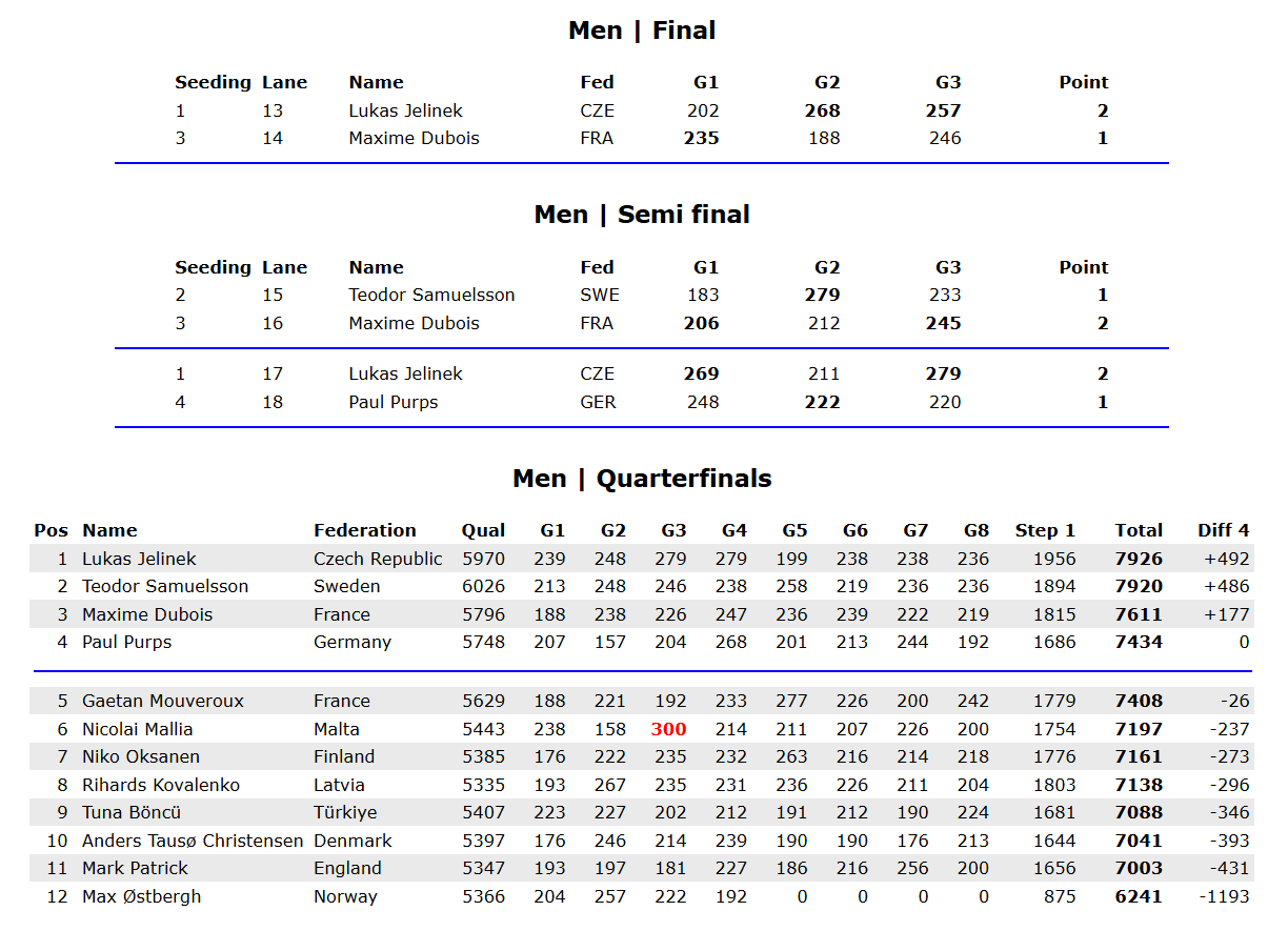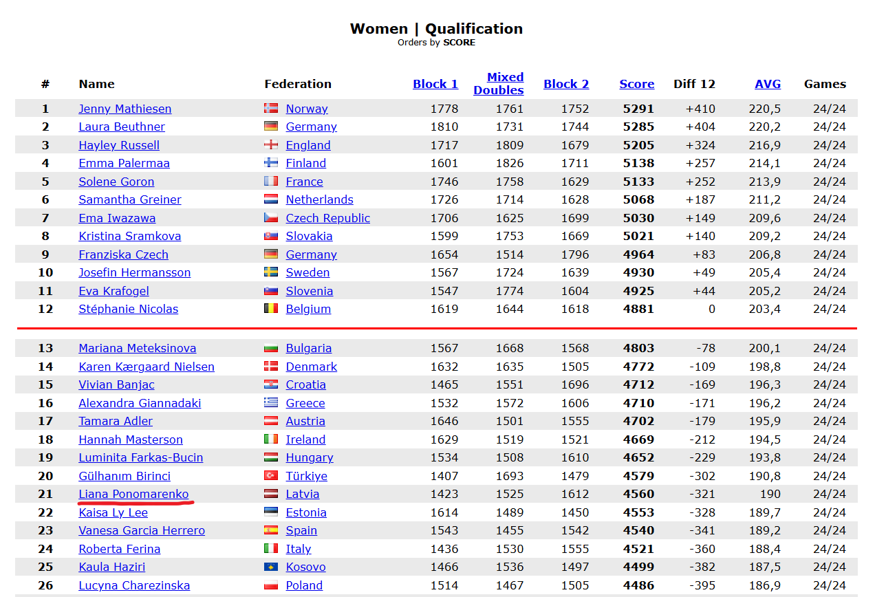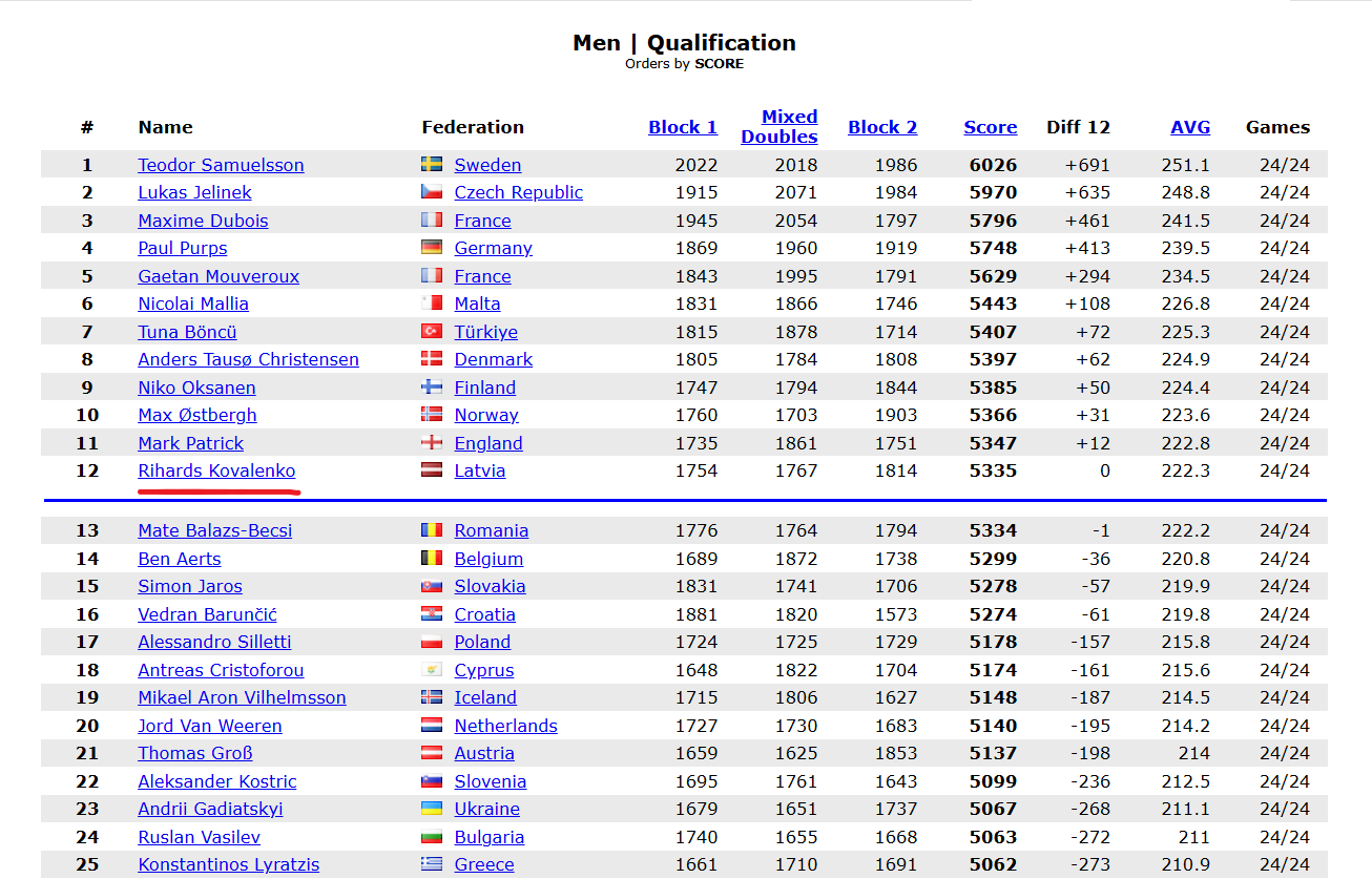 Rihards Kovaļenko kvalifikācijā izcīnīja 12 vietu un līdzīgi kā 2024 gada Latvijas Meistarsacīkstēs, fināla spēlēm kvalificējās pēdējā spēlē. Rihards pēdējā spēlē uzmeta 266 un tas viņam deva uzvaru pār Rumāni ar 1 ķegli. Top 12 Rihardam vidējais: 225,38, kas kopsummā deva 8 vietu. Ja netiktu ņemta vērā kvalifikācijas kārtas ķegļu summa, tad Rihards būtu 4 vietā!!!