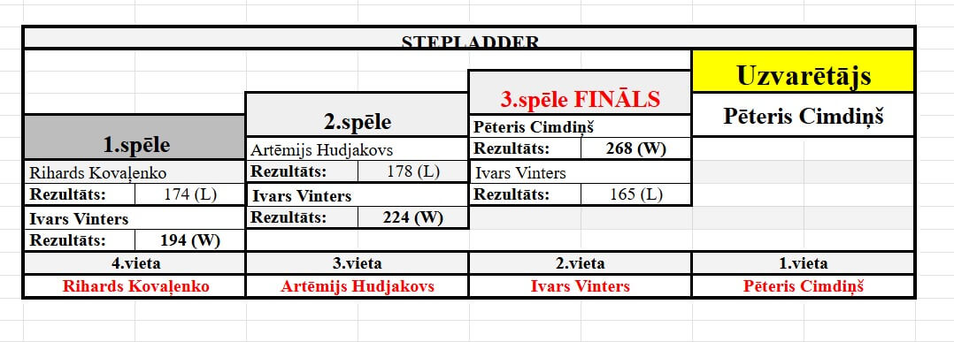 12:15 – 13:30 – fināls (TOP 4) stepladder